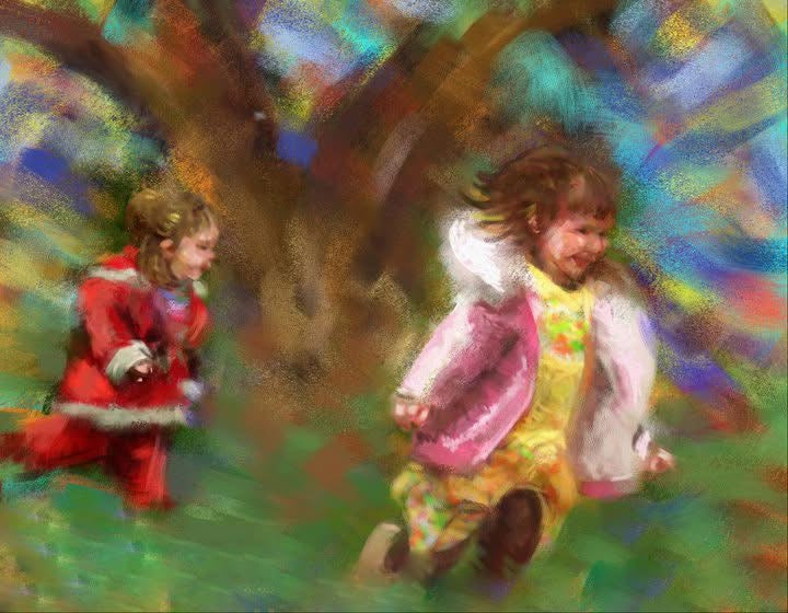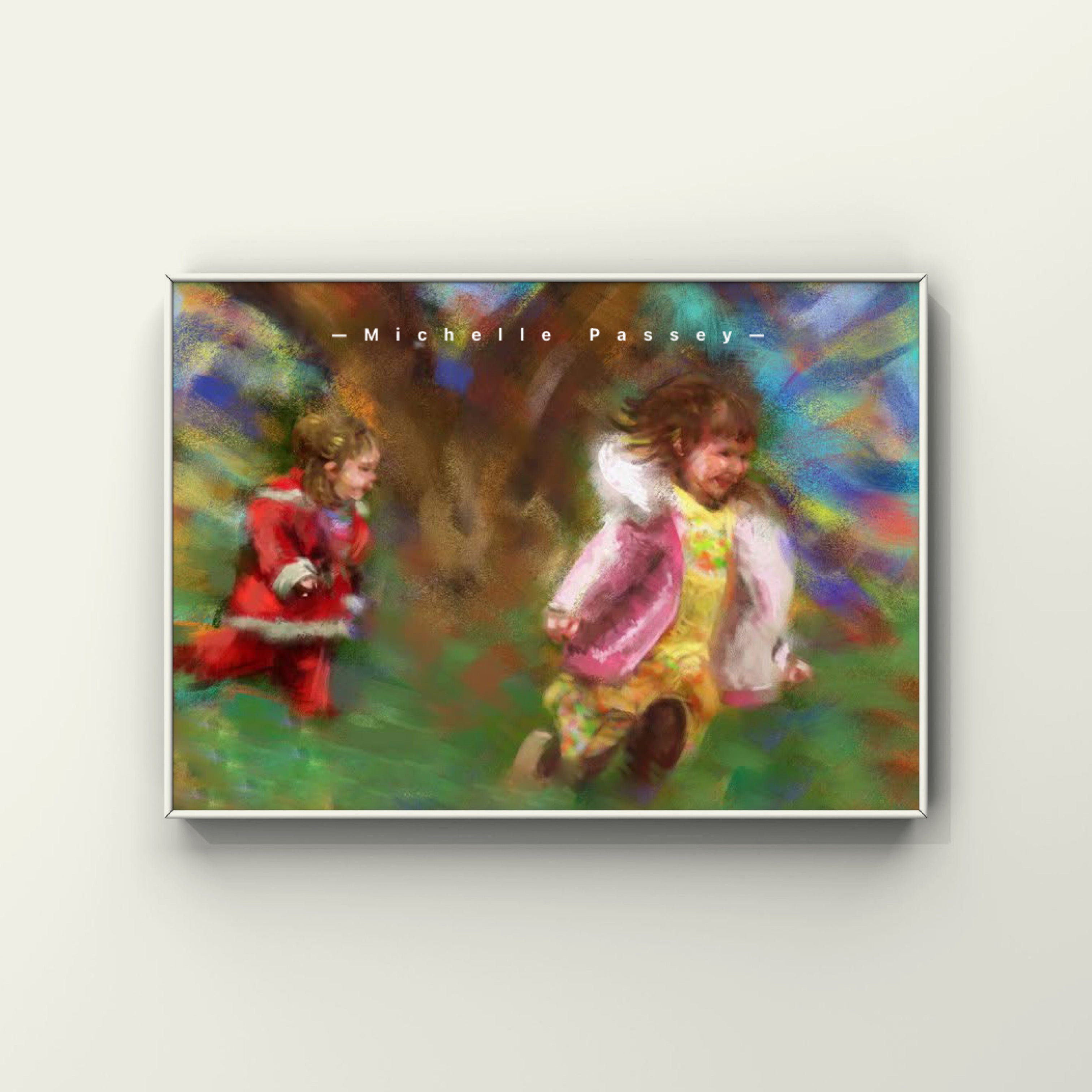 Catch Me If You Can” is a fine art print created from my original 24x36 pastel painting. Inspired by the energy of my daughters growing up, this piece captures the wild joy of childhood play, the laughter, the chase, and the unstoppable motion of a moment too good to forget.